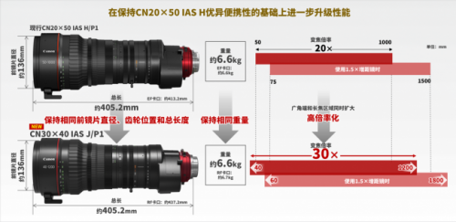 两款30倍变焦镜头覆盖从40mm广角到1200mm超远摄的广泛焦距范围;在使用1.5倍内置增距镜时,不仅焦距范围可扩展至最大1800mm,还可用于搭载35mm全画幅图像感应器的摄影机。此外,在将变焦倍率从20倍提升至30倍的同时,CN30×40 IAS J/P1保持了与前代型号相同的约405.2mm总长度和约6.6kg重量*3,提供了出色的便携性。至此,佳能电影伺服变焦镜头系列覆盖了从11mm到1800mm的宽广焦段。